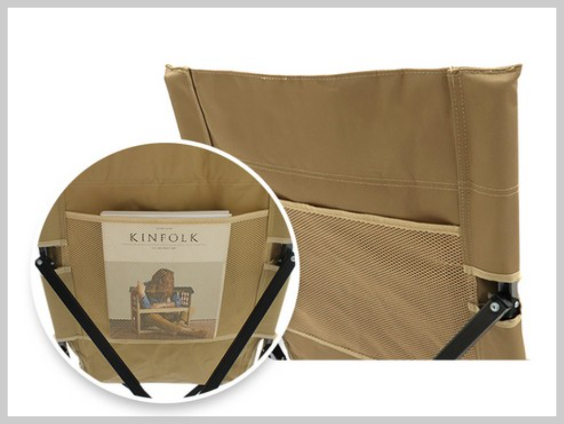 하이백 스타일의 등받이는 장시간 앉아 있을 때 목과 허리를 받쳐줘 더욱 편안합니다. 일반적인 저가형 캠핑 체어보다 안정감 있는 착석감을 제공합니다.